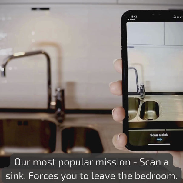 Vårt populäraste uppdrag "Skanna ett handfat" är lika enkelt som genialiskt: Alarmet stängs först efter att du "bevisat" att du är vaken genom att ta ett foto på ett handfat i appen. Om du känner att du direkt kommer återvända till sängen efteråt så kan du välja att det ska krävas att du skannar handfatet vid två tillfällen med ett satt intervall däremellan. Det gör att man stannar uppe och under tiden man väntar på att skanna igen så vaknar man till liv och håller sig vaken resten av morgonen. Om inte det är nog så finns det ytterligare uppdrag som "Håll dig i rörelse" och "Skanna din bäddade säng". Läs mer om dom i "Så fungerar det".
